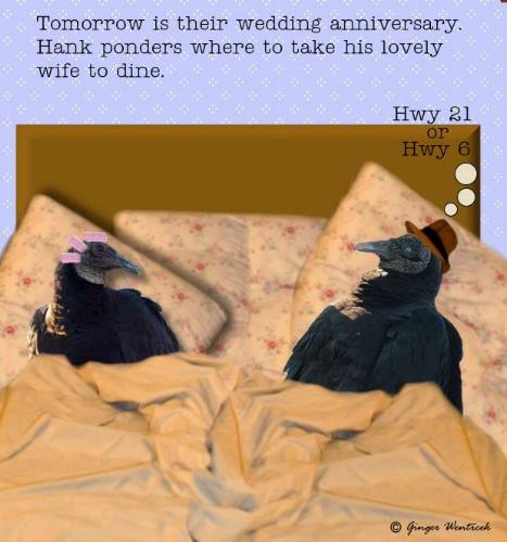 How many times have you been scooting down the highway in your Model A and all of a sudden you had to slow down to keep from hitting some giant birds that were having a snack in the middle of the road? Well, meet Hank and Ethel, who like to dine on the roadway. Yes, you guessed it - they are buzzards. However, Hank and Ethel are not your ordinary, typical buzzards. Have a laugh or two as they dine, play, and do some pretty funny buzzardy things.